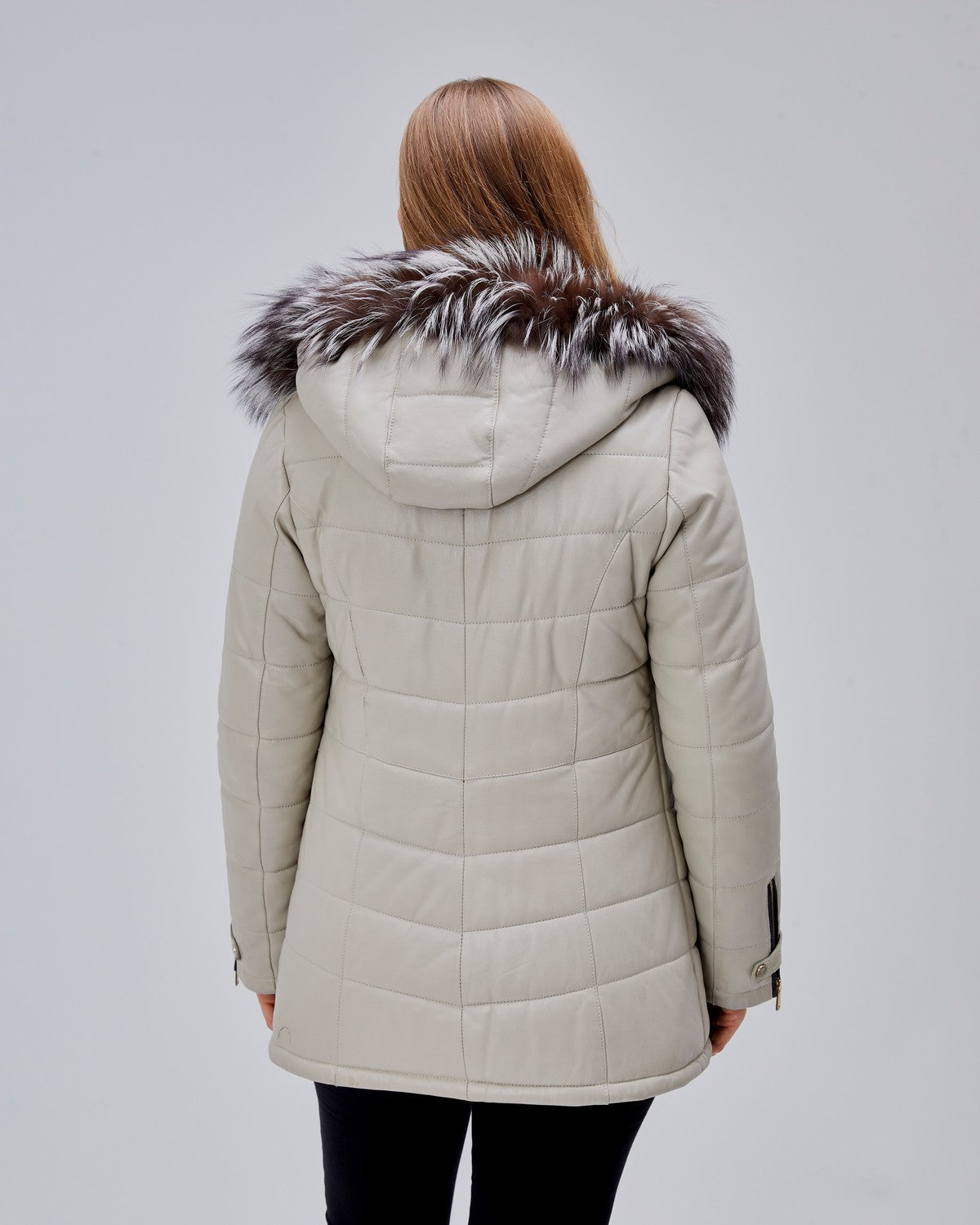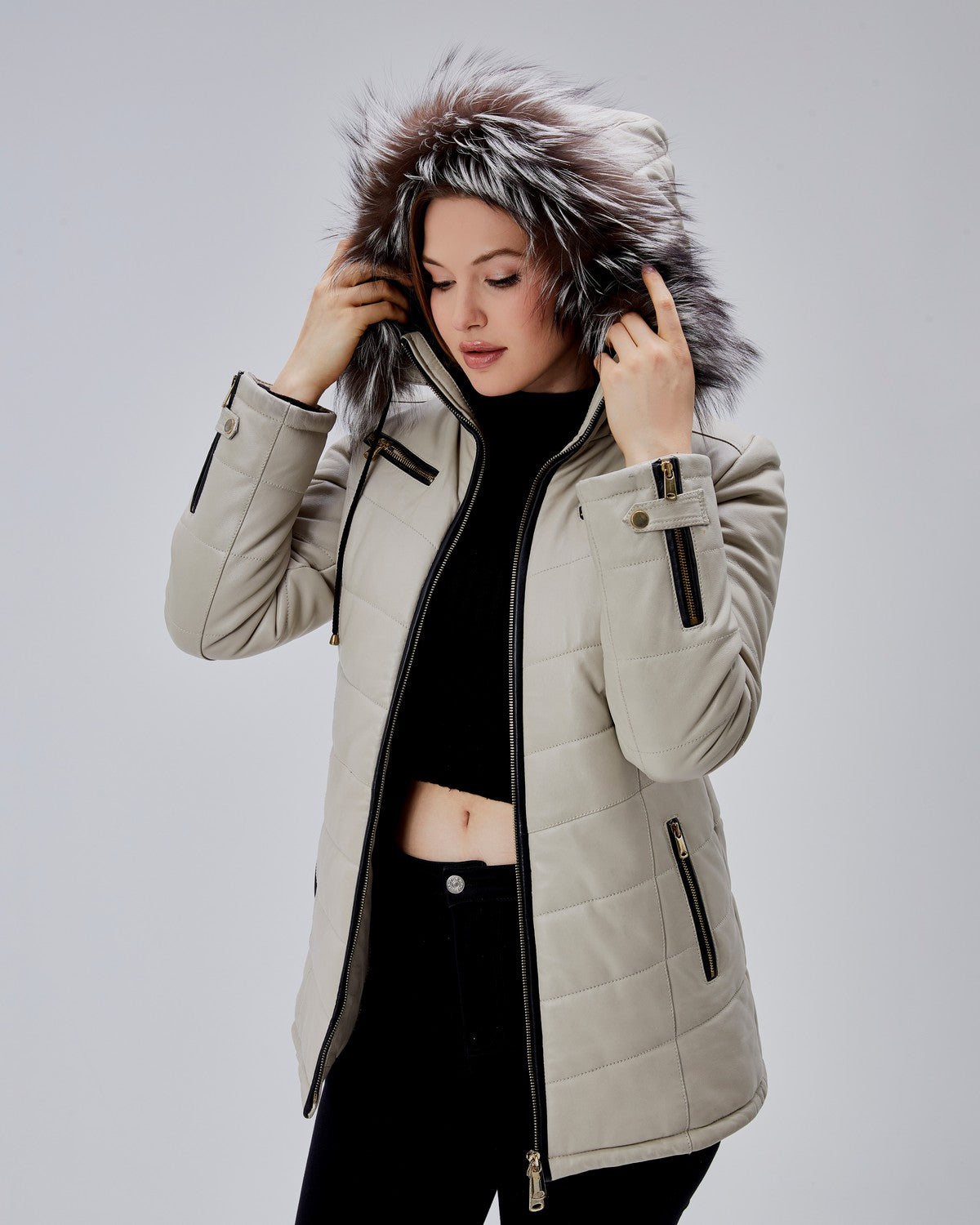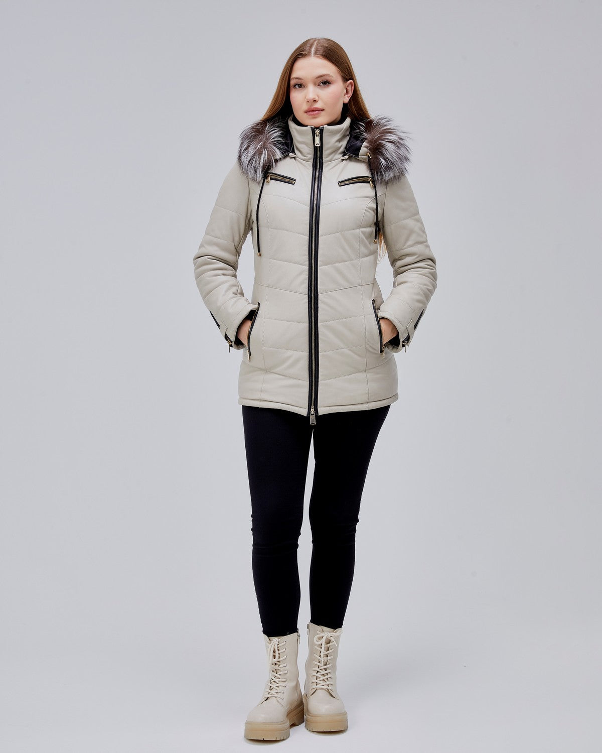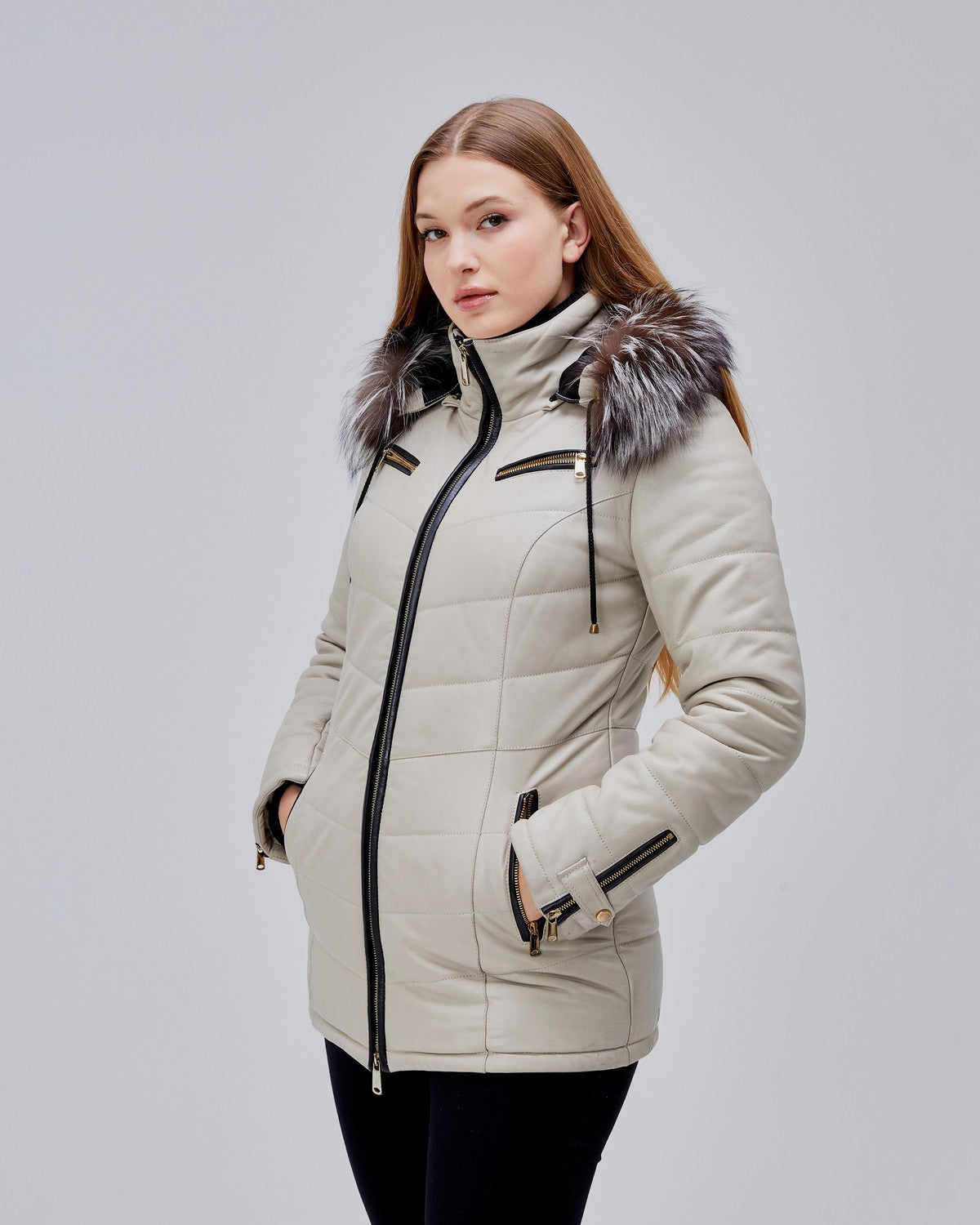 Ce modèle est équipé de quatre poches zippées, dont deux à hauteur de poitrine, offrant un look moderne et une grande fonctionnalité. La capuche en cuir est entièrement amovible et bordée d’une fourrure véritable, idéale pour passer d’un look urbain à une allure plus habillée en quelques secondes.