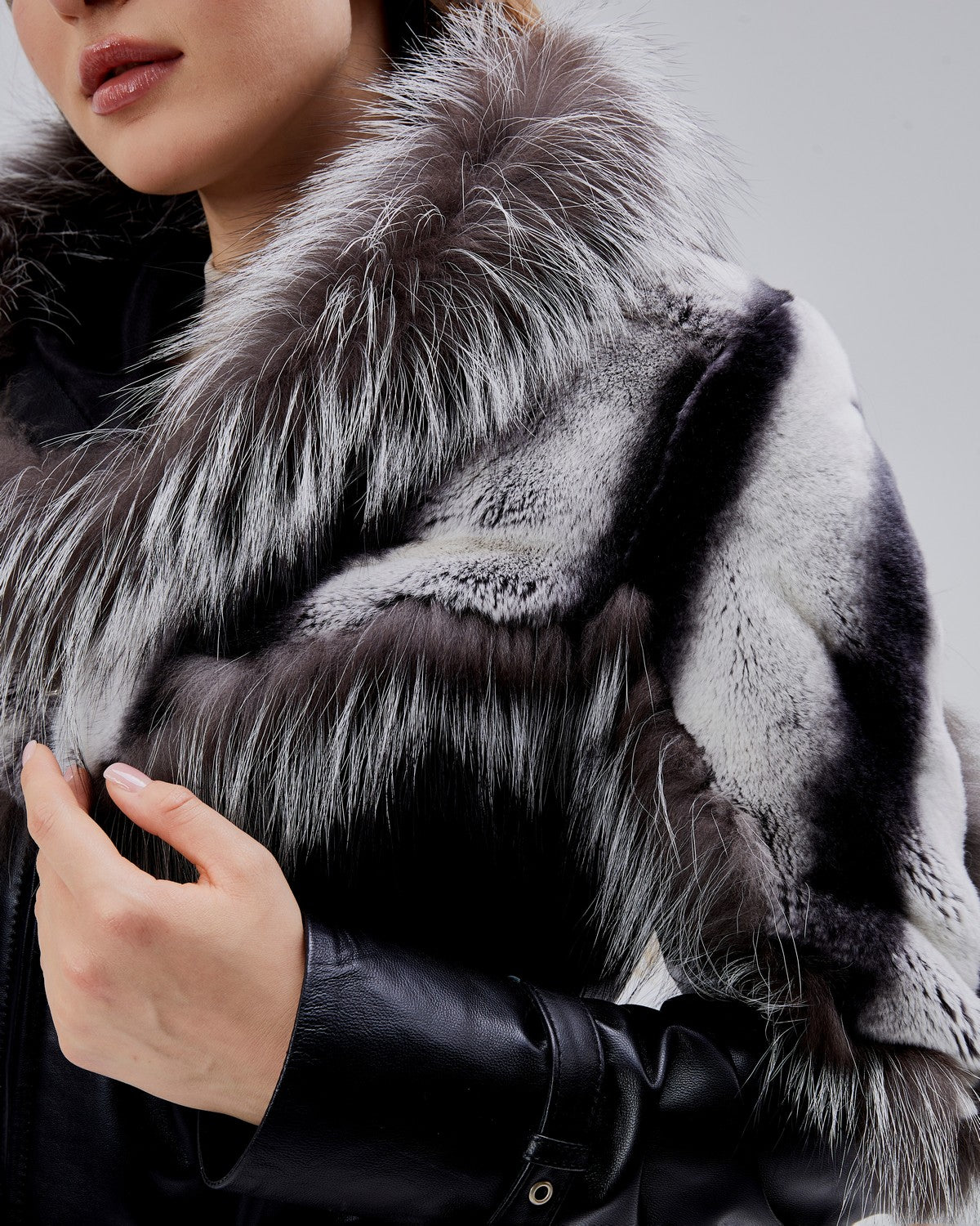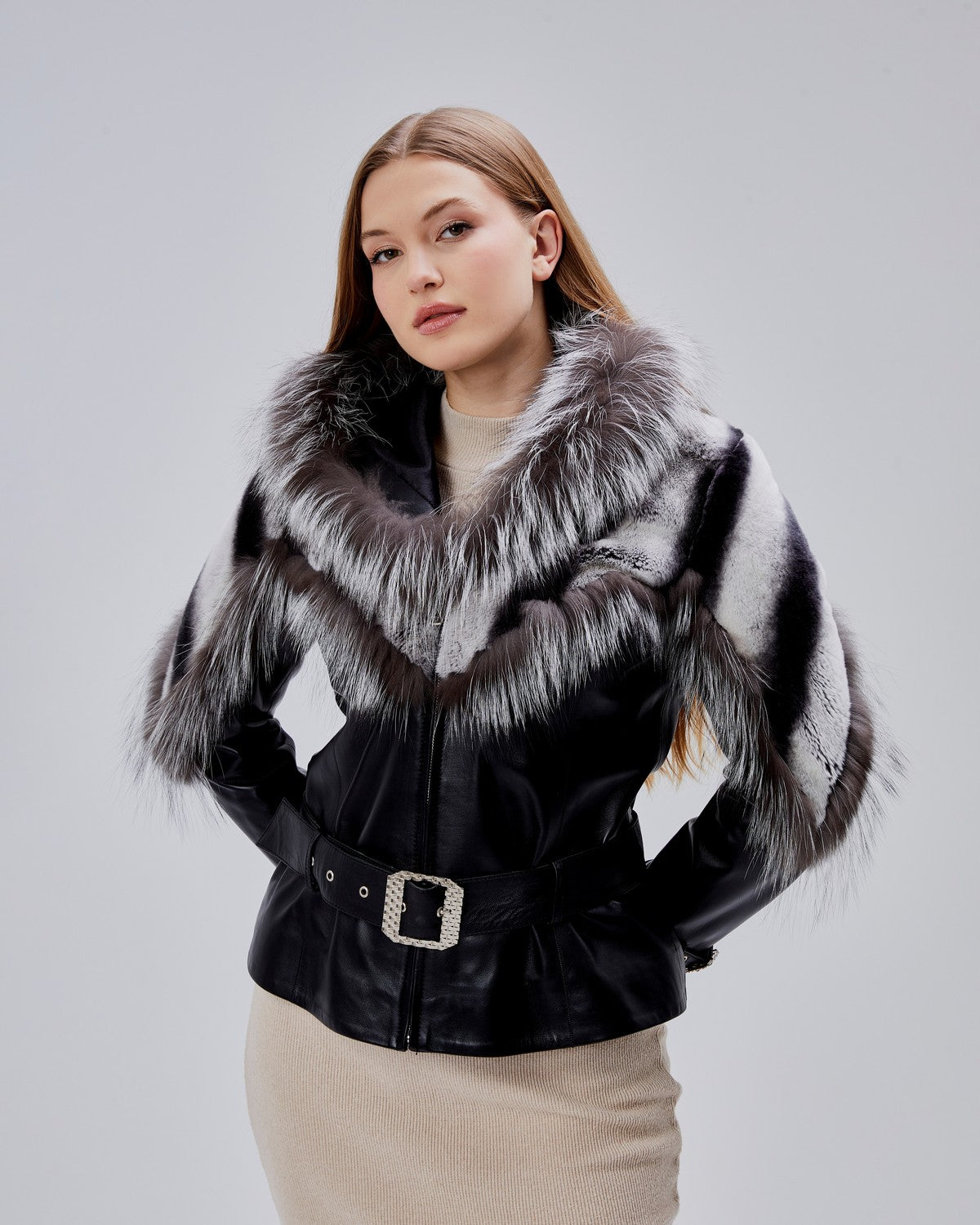 Veste en cuir d’agneau véritable au design sophistiqué, sublimée par une somptueuse fourrure de lapin disposée sur les épaules et le col. Cette pièce se distingue par son allure luxueuse et féminine, idéale pour celles qui recherchent une veste chic et chaleureuse pour l’hiver ou la mi-saison.