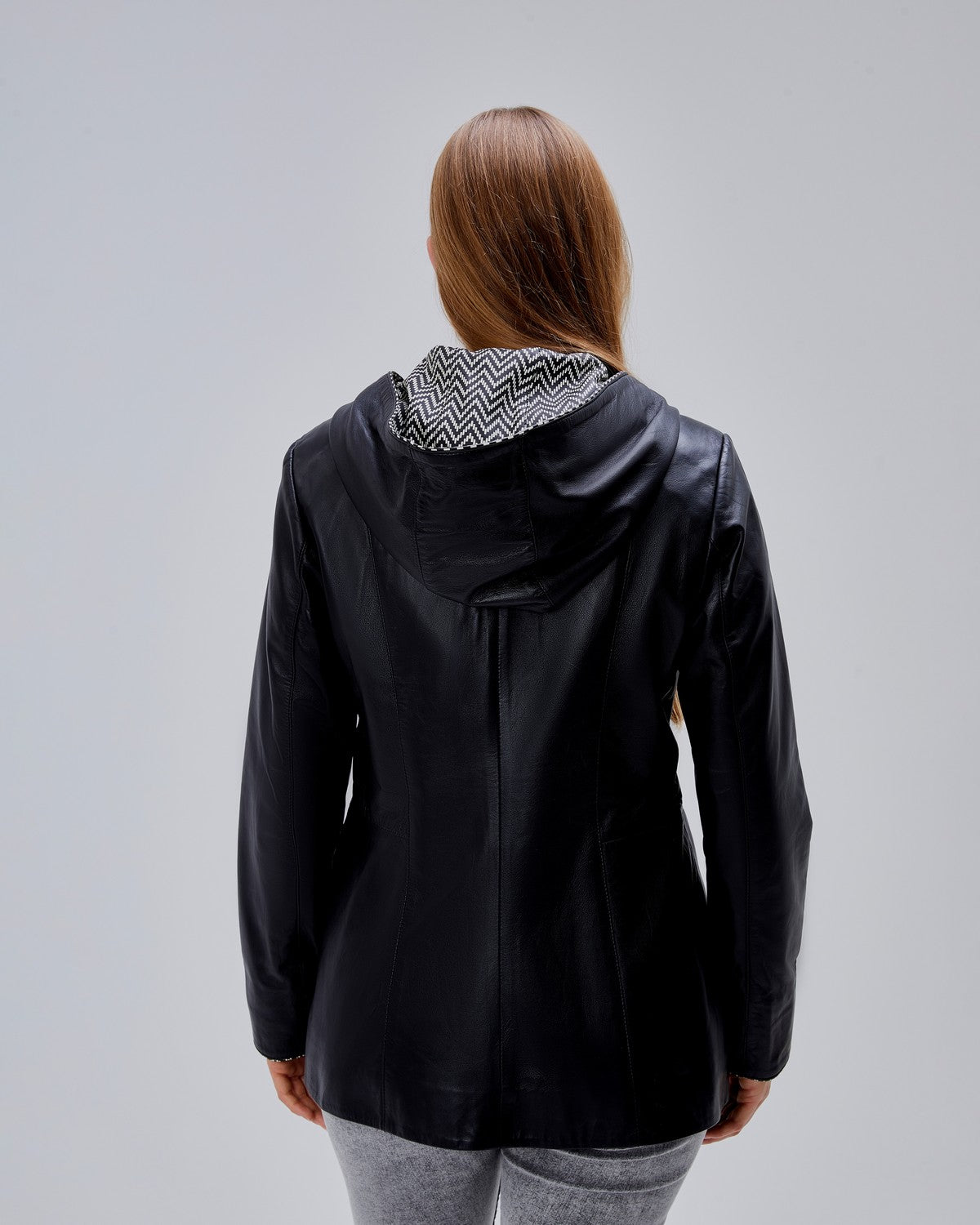 Cette veste en cuir d’agneau véritable se distingue par son style moderne et ses finitions soignées. Le design intérieur de la capuche en cuir imprimé, assorti aux poignets et à la fermeture, apporte une touche graphique très actuelle, tout en restant discrète et raffinée.